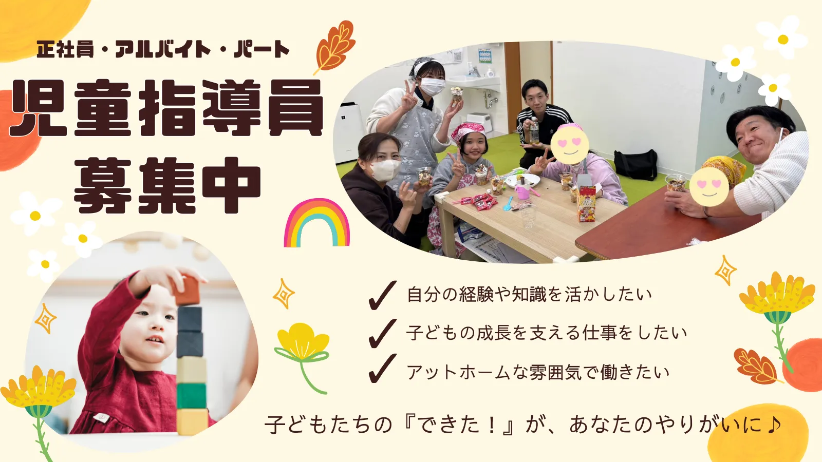子どもたちが自ら挑戦し、失敗も成功も経験しながら成長していけるよう、気持ちに寄り添い、全力でサポートいたします。